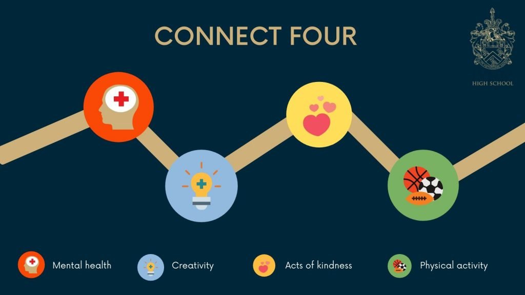 To play Connect Four, students must complete one task in each of the four categories: Creative, Physical activity, Act of Kindness and Mental health & relaxation. The categories and tasks are listed below.