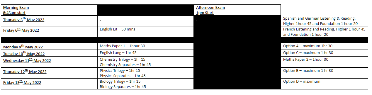 Year 10 Mock Exam Timetable