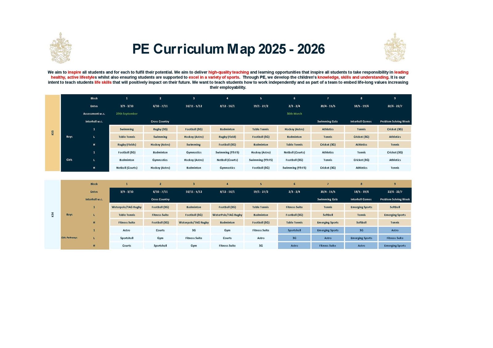 - It is our intent to teach students life skills that will positively impact on their future. We aim to deliver high-quality teaching and learning opportunities that inspire all students to take responsibility in leading healthy, active lifestyles whilst also ensuring students are supported to excel in the chosen sports. We want to teach students how to work independently and as part of a team to embed life-long values.