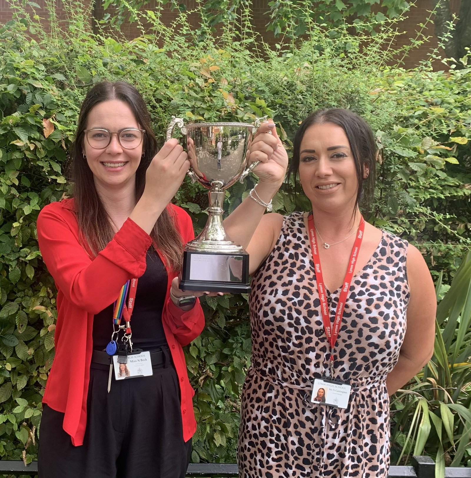 Arley is the current holder of the Inter-Hall Trophy. The photo shows Miss Beck (left) and the Year 7 Pastoral Support Manager, Miss Carrington.