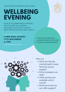 The Wellbeing Evening will include a presentation from our Mental Health Lead Mrs Hunter alongside information from the School Nurse service and Kooth.com. The evening will explore a variety of mental health difficulties faced by young people together with practical strategies and advice for parents and carers to help support our students with their wellbeing.